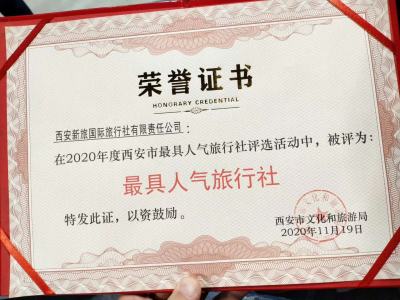 西安新旅國際旅行社榮獲最具人氣獎